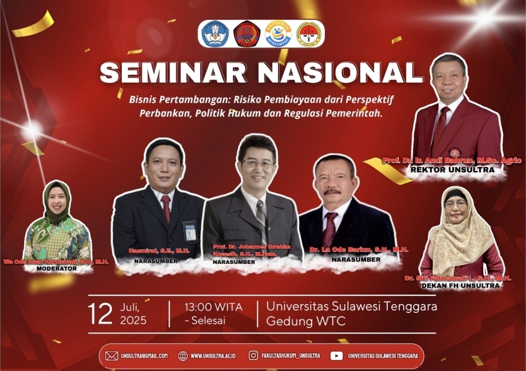 Di atas podium, hadir pula tiga pemateri dengan bobot keilmuan dan pengalaman yang menggugah. Prof. Dr. Johannes Ibrahim Kosasih, S.H., M.Hum. sebagai ahli hukum perbankan, Dr. Ld Bariun, S.H., M.H., pakar politik Hukum Unsultra dan Hasmirat, S.E., M.H., mewakili Bank Sultra sebagai Kabag Pemasaran Kredit.
